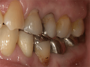 まずは主訴の改善から行います 痛みを取ることは先決です。左下の中央から4番目の歯、右の写真の、右側の奥から4本面の白い被せものがしてある歯です。根の先に病巣を作っています。外して膿を出していきます レントゲンを撮影して、口腔内写真、必要ならば歯の模型をとります |