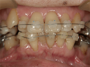 上下の歯にブラケットをセットします。凸凹がひどくて付けられないところは、ある程度歯が動いてから付けるようにします